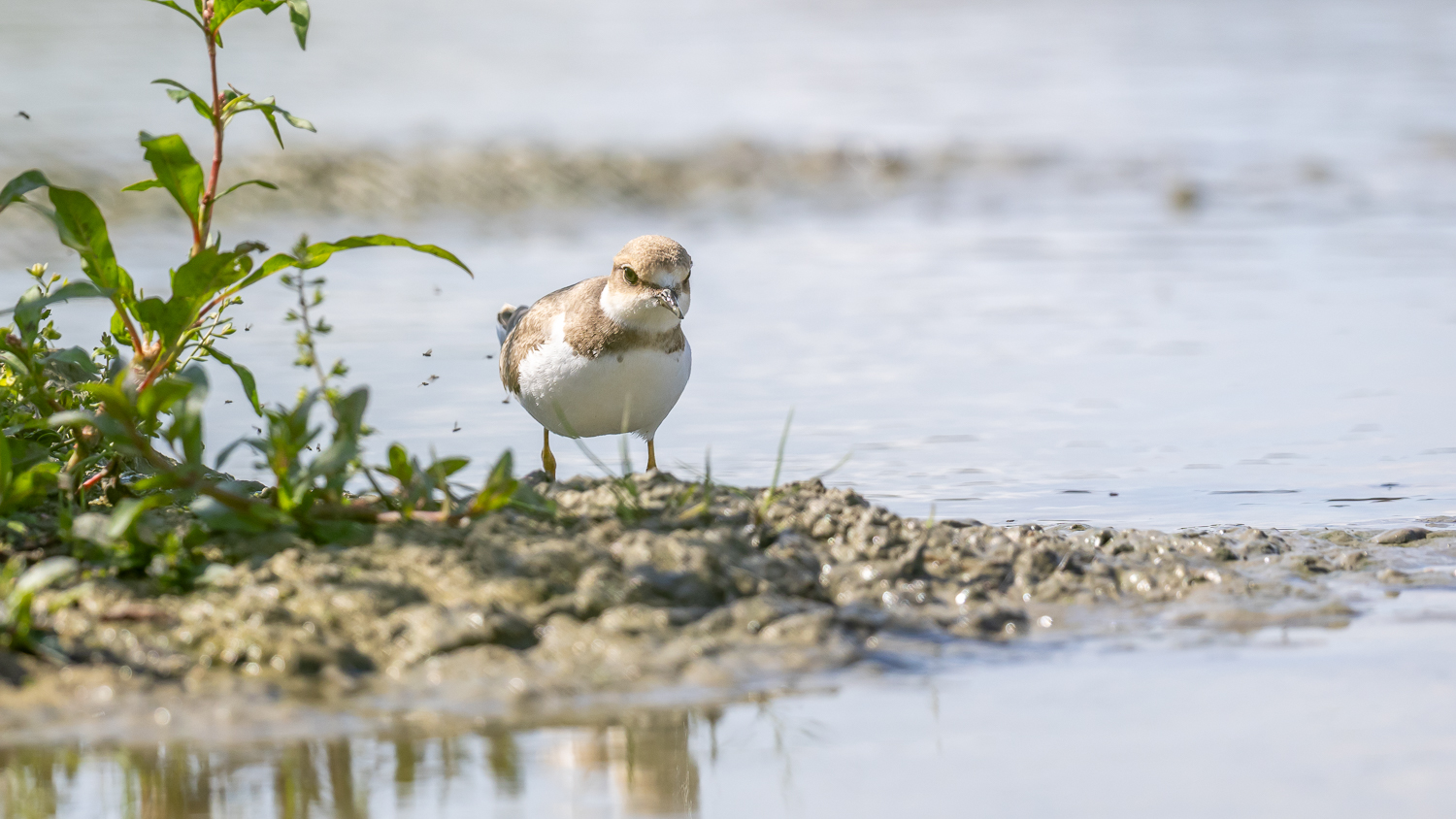 Dicht bij de hut zijn de jonge kieviten mooi te bekijken. Ze hebben nog geen volledige kuif, hun veren zijn nog niet volledig op kleur, en de veren zijn nog niet volledig aangesloten door nog aanwezige donshaartjes.Het verenkleed van de jonge plevieren zijn grijzer en de nek band is nog minder goed ontwikkeld. Rondom de hutten staat het water wat minder hoog en zijn er wat drooggevallen eilandjes begroeid. Dit gebied wemelt van de kleine vliegjes en mugjes. In het modder liggen de larfjes van de mugjes = vers de vase. Veel jonge vogels doen zich hieraan tegoed.
