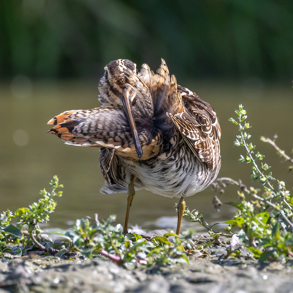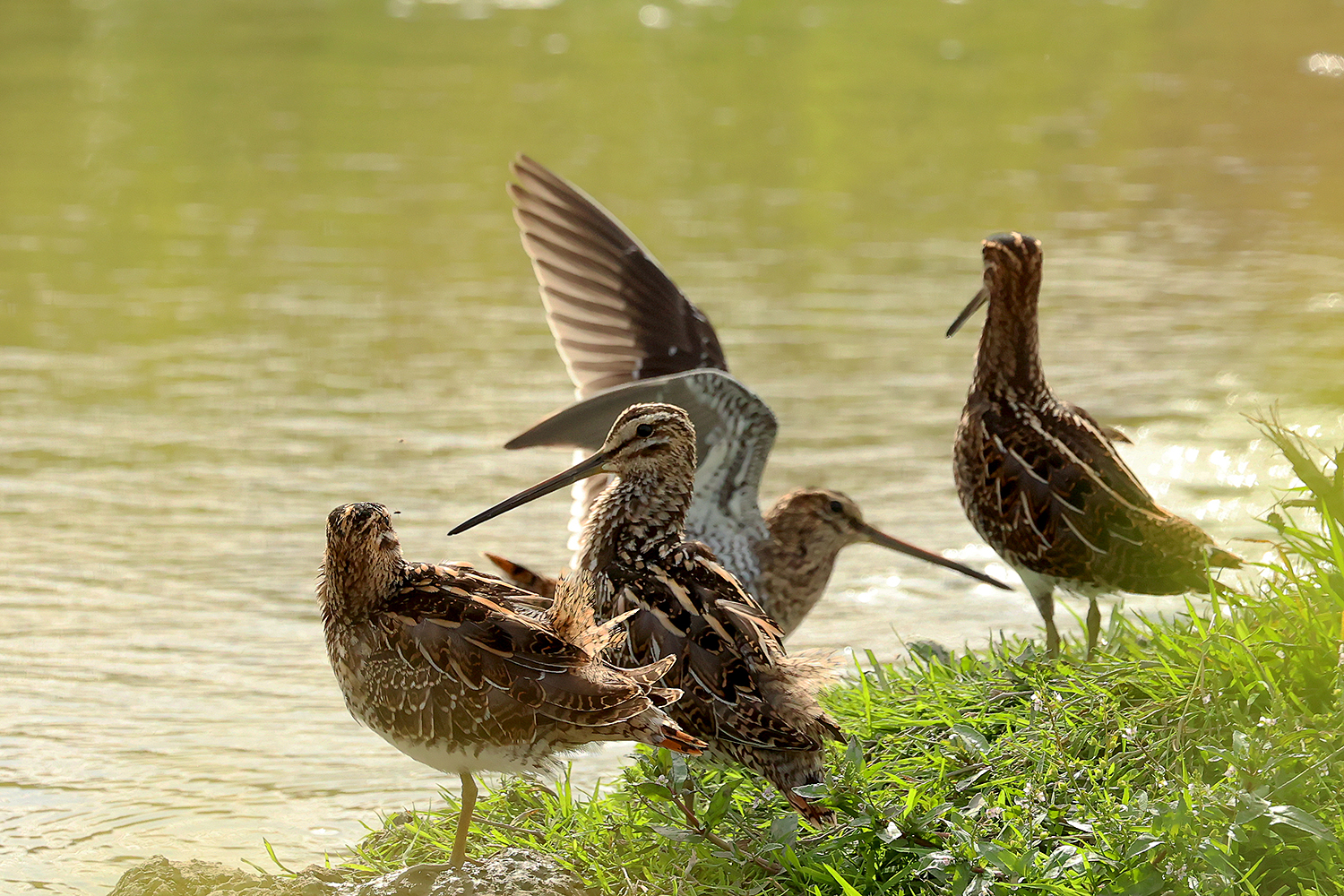 Er zit weer een grote groep watersnippen in de plas. Met hun typische op en neer gaande beweging van de kop, zijn ze druk in de weer om in de plas wormen en vers de vase te vinden. Maar ook zij zijn heel gevoelig voor verstoring. Zo kan het opeens gebeuren dat ze vanuit de rust, plotseling een spurt nemen of weg vliegen. Bij gevaar gaan ze plat liggen en trekken ze hun staart veren omhoog. Maar zodra het weer rustig is geworden, wordt het verenkleed weer uitgebreid onder handen genomen.