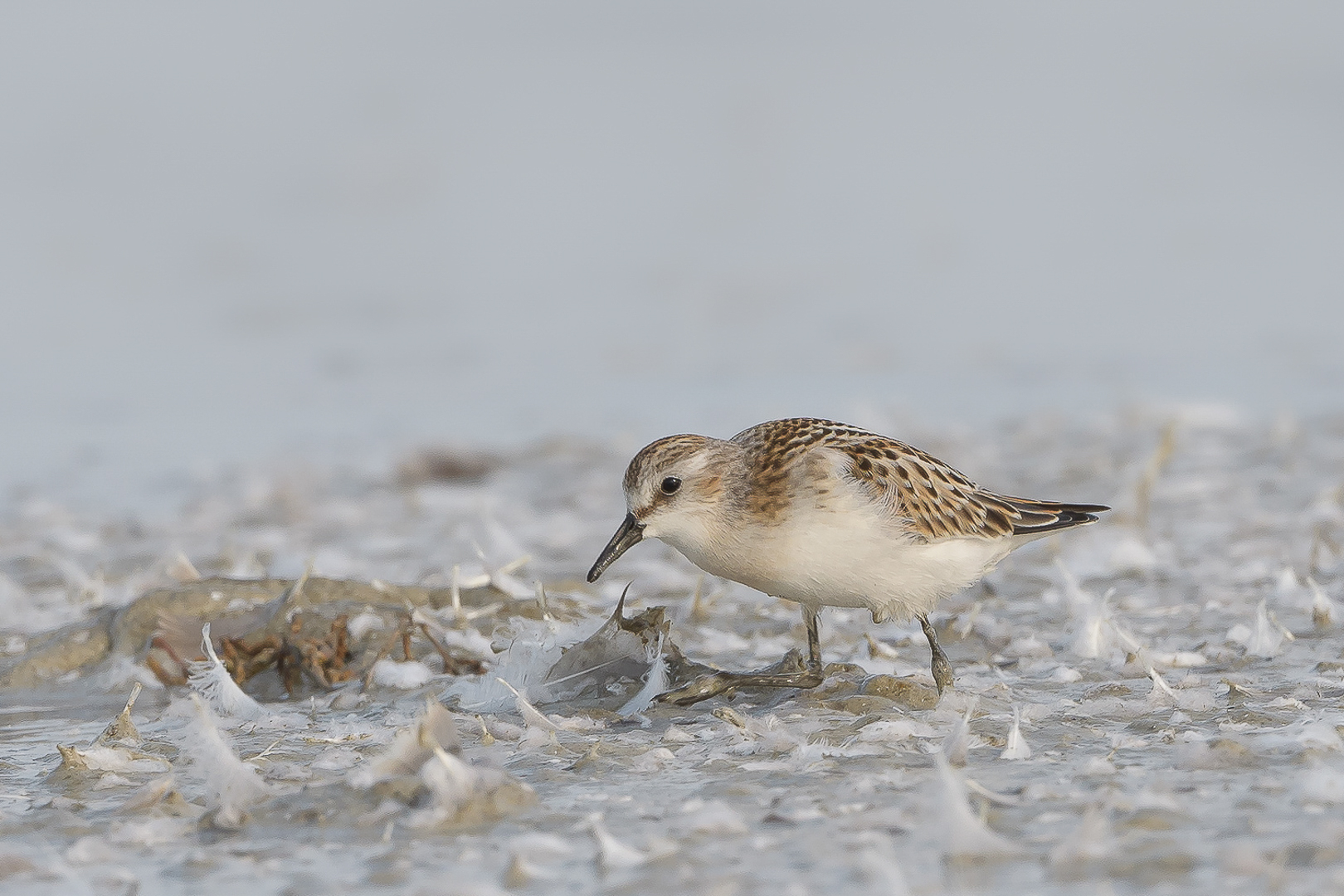Herkenning: rug en borst grijsbruin gespikkeld; onderzijde witachtig; kleine strandloper donkere poten; Temmincks strandloper lichtgekleurde poten