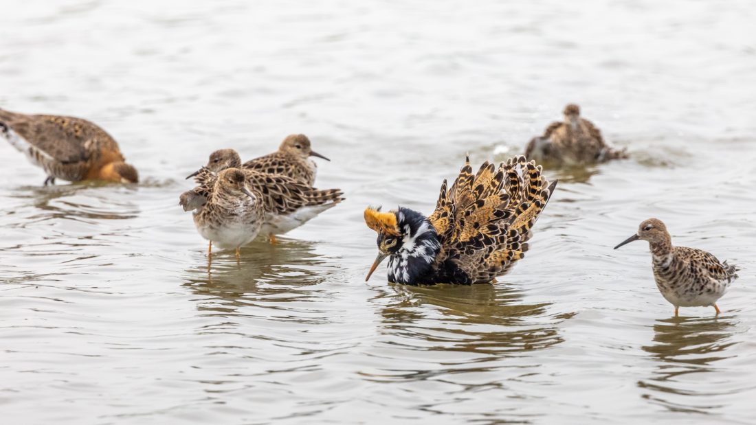 Murk weet te melden dat er nog steeds twee nesten van de kleine plevier aanwezig zijn, met respectievelijk drie en vier eieren. De vogels zijn vanuit de fotohutten te zien en te fotograferen. Servan Ott zag afgelopen week een roerdomp langs vliegen. Ook geen alledaagse gast voor Gruttoland. Nog een vogel die wel vaker, maar niet heel vaak, gezien wordt was de Temmincks strandloper afgelopen week. De grote groep kemphanen, die enkele weken in Gruttoland verbleef is sinds enkele dagen nagenoeg vertrokken. Er hangen er nu nog zo’n stuk of tien rond en de rest is waarschijnlijk op weg naar de broedgebieden in het noordoosten. De laatste dagen in Gruttoland waren de hanen echter prachtig op kleur en speelden de hormonen flink op. Er waren vaak schijngevechten te zien en menig mannetje maakte een vrouwtje het hof. Met 35 hennetjes en vijf haantjes hadden de mannen het er maar druk mee.